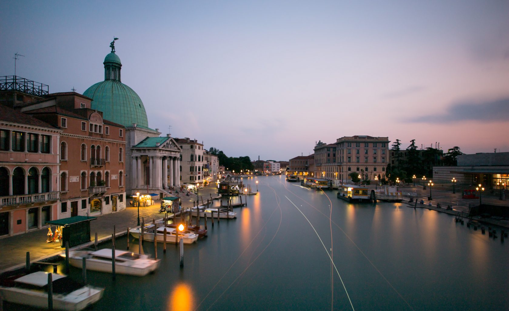 In this way we can use ND filters and very long exposure times to shoot overcrowded places without the people in them. Because people are moving and they leave no traces in the final photograph. Here is a photograph of Venice in the evening when the streets are full of people and the canals are full of boats. Only a couple of boats left bright traces.