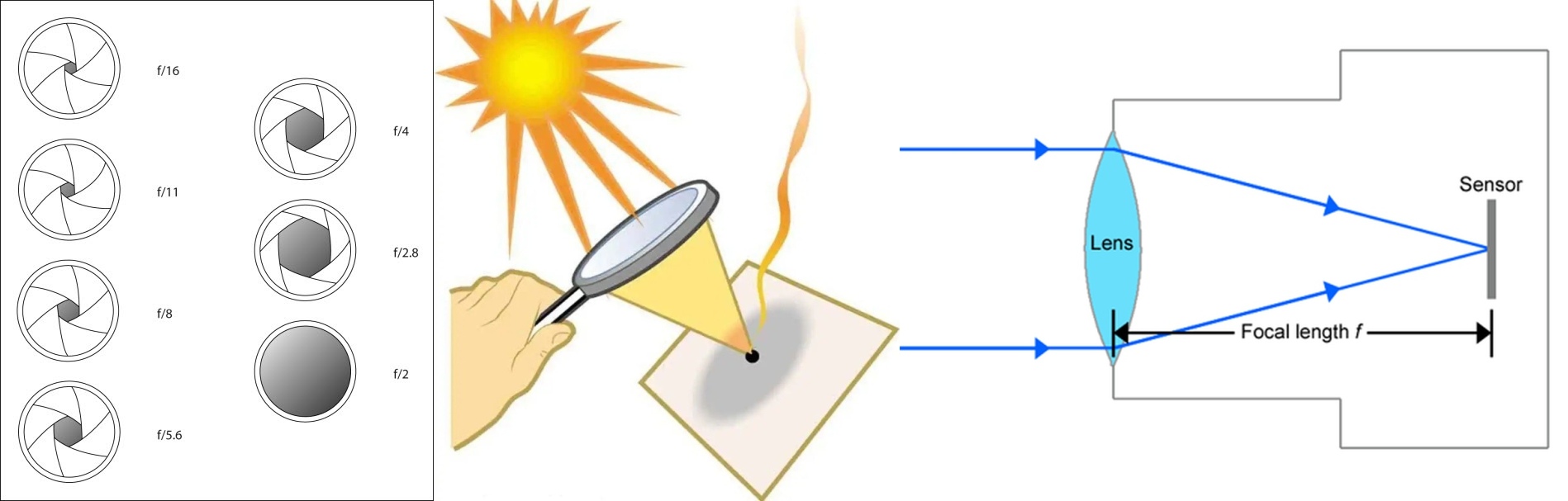 Probably we have all had the experience of playing with a magnifying glass as children, trying to burn a hole through a piece of paper by focusing sunlight. There is one specific position of the lens which causes a small bright dot to appear on the sheet of paper – this is the projection of the sun. A magnifying glass is a simple lens similar to a monocle and if you measure the distance between the magnifying glass and the projection of the sun, you will find the exact focal length of this lens. And so – the greater the focal length of the lens, the lower its light power, which is inversely proportional to focal length. To put it simply, the light power (aperture) is the ratio between the maximum diaphragm opening and the focal length of the lens. If you have a lens with a 50mm maximum opening and focal length of 100mm, its light gathering power will be 50/100 or 1:2 . For such a lens we say that it has aperture f/2. If a 50mm maximum opening corresponds to focal length of 200mm, its respective light-gathering power will be 1:4 or aperture f/4. A lens with aperture f/2 lets in 4 times more light than one with aperture f/4. Often beginners find it hard to understand why a higher aperture value means less light. Why a lens with aperture 4 lets in less light that one with aperture 2. The explanation is simple – these are denominators.in a fraction. 1:2 is a greater number than 1:4 the same way half a pizza is more than a quarter.