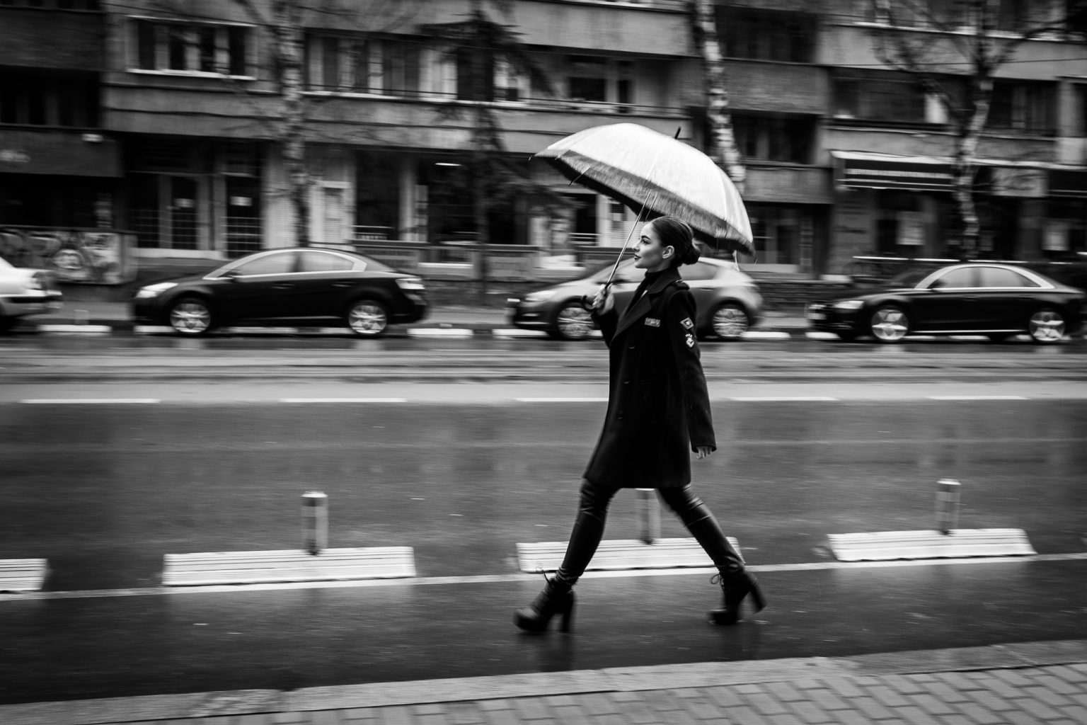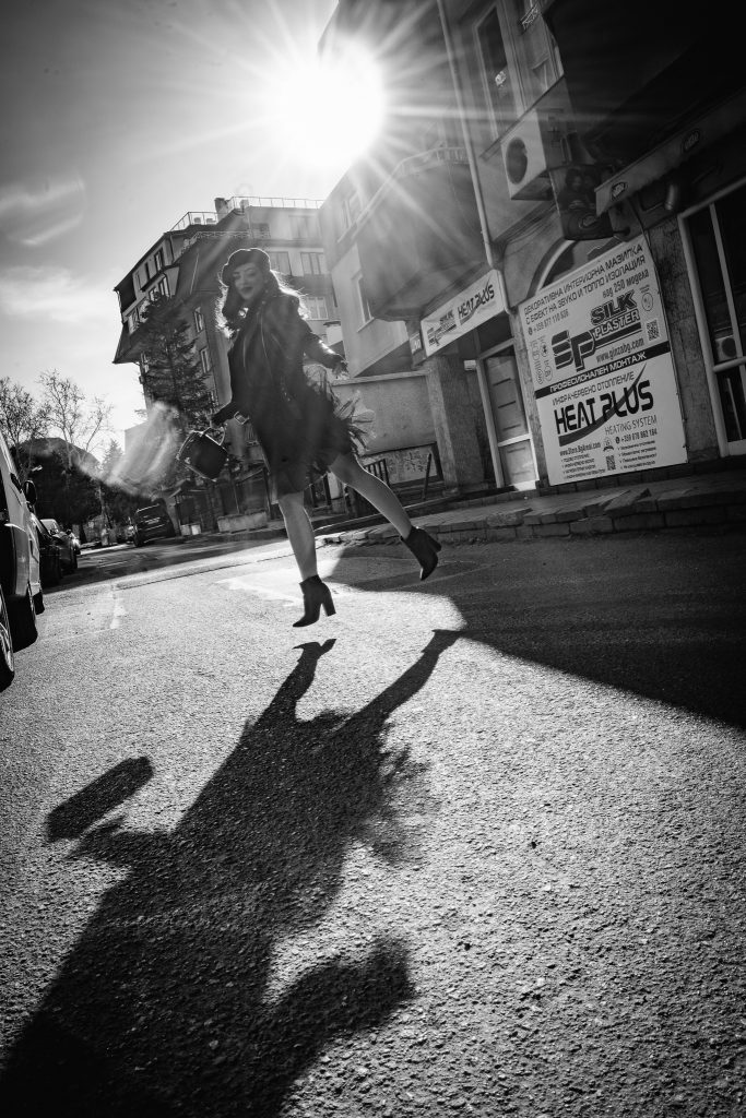To achieve this effect we need to shoot at relatively low shutter speeds – for slow motion (a walking person, a slowly moving bike or car) shutter speed can be set at 1/15 – 1/20 sec. You need to take a stable position and move the camera parallel to the moving object. When using such low shutter speeds, it is important to keep the camera steady in order to avoid vertical shakes; it is also important not to move too quickly or slowly relative to the main object. Otherwise, the whole scene will be blurred and we will lose the contrast between the sharply defined moving object and the background. For higher speeds – a car, a train, etc., shutter speed can also be set higher (shorter exposure time) 1/40 – 1/50 or even at 1/100 sec. You should know that the term ‘shutter speed’ is professional jargon. The correct term would be ‘exposure time’. 1/40 sec is a measure of time. The higher the shutter speed, the shorter the exposure time and a less defined motion as the background will not be as blurred. Low shutter speeds (longer exposure times) enhance this motion effect, but also increase the number of failed shots. Therefore, it is a good idea to take several shots in a series in order to select the best one.
