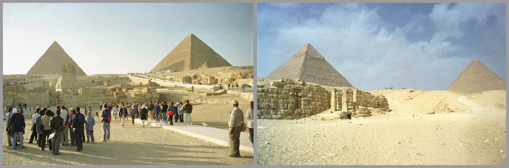 Here are two photographs taken at the same place, but having completely different messages. The first photograph shows the pyramids as a highly commercialised and urbanised place. The second photograph which was taken only a few hundred metres to the side shows the pyramids as a mysterious place at the beginning of the desert.