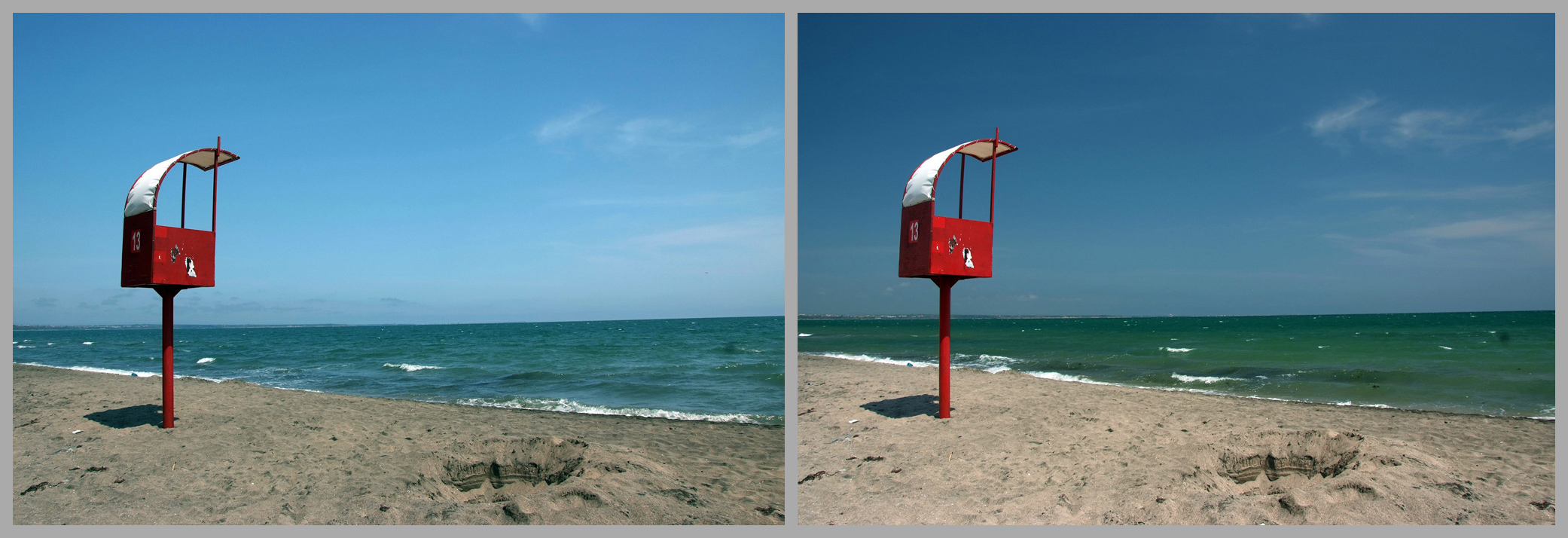 This filter cannot be emulated using a software programme because if the camera did not see what was behind the reflection, there is no software to reveal what was hidden in the photograph. In the next two shots, the sea on the left is blue because the sky is reflected in it. In the right photograph using a polarizing filter, the sea is green because the reflection from the top layer of the water was removed and the camera could see the actual colour of the water and the sand underneath.