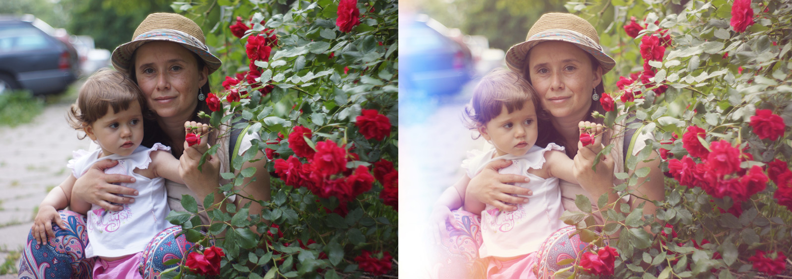 In this photo the flares are natural because it was taken using an old Soviet lens Helios 44 which does not have an anti-reflective coating on the lenses. However, such light spots can be added later on, because many editing programmes also have flares as inbuilt effects. They look like this and can be placed in different places within the frame.